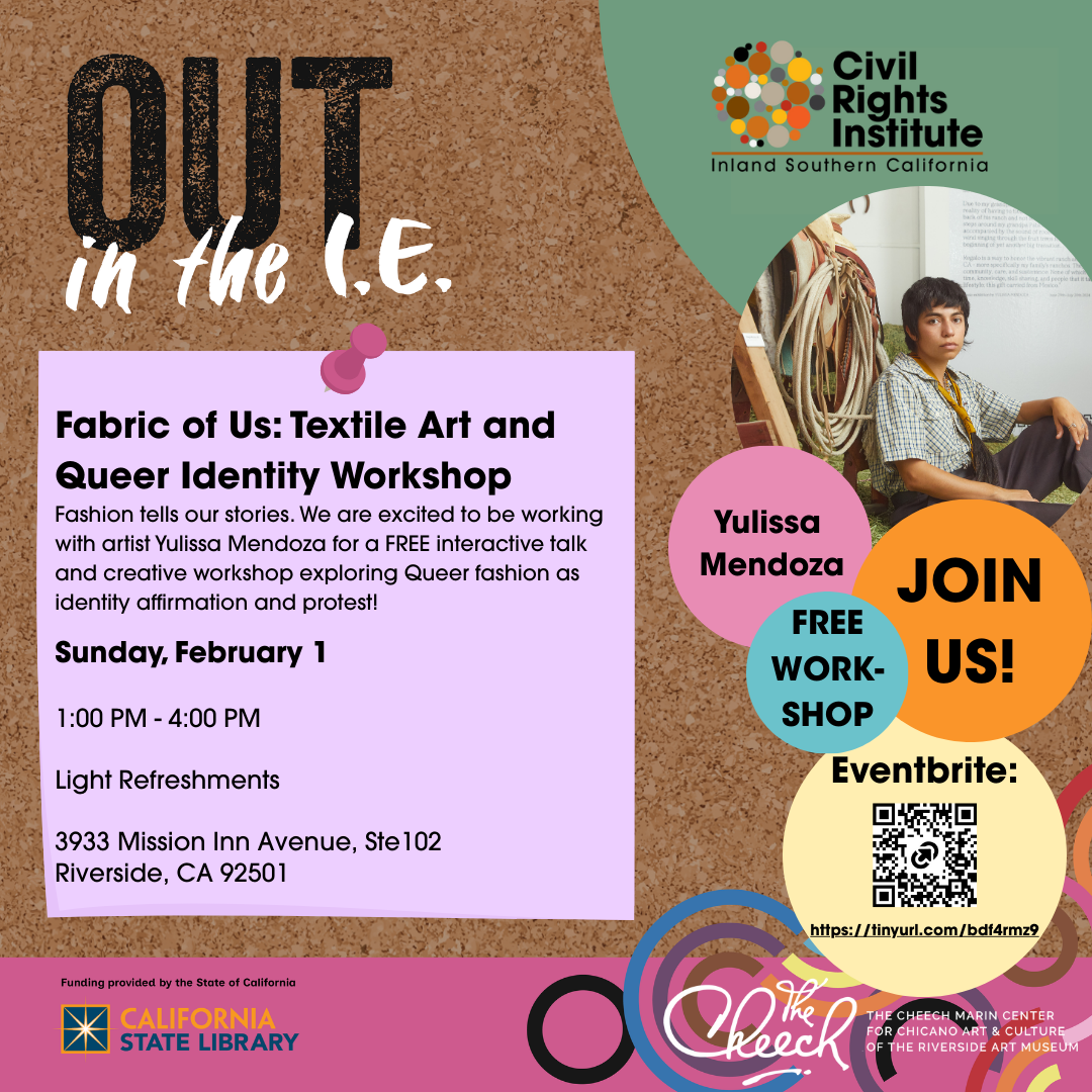 CRIISC is excited to partner with artist Yulissa Mendoza and The Cheech Center for Chicano Art & Culture of the Riverside Art Museum for Fabric of Us: Textile Art and Queer Identity Workshop. Join us for an afternoon of creativity and conversation as we sit down with Yulissa to explore their artistic journey, inspirations, and the themes that shape their work,~ followed by a hands-on textile art workshop. Come get inspired, connect, and create alongside a local I.E. artist. We can’t wait to see you!